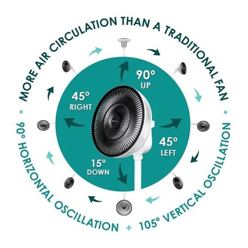 With the touch of a button, the fan will rotate 90º horizontally. Another button and the fan will rotate 105º vertically. By selecting both oscillation features, the fan will change directions freely to circulate the air throughout the entire room.Â